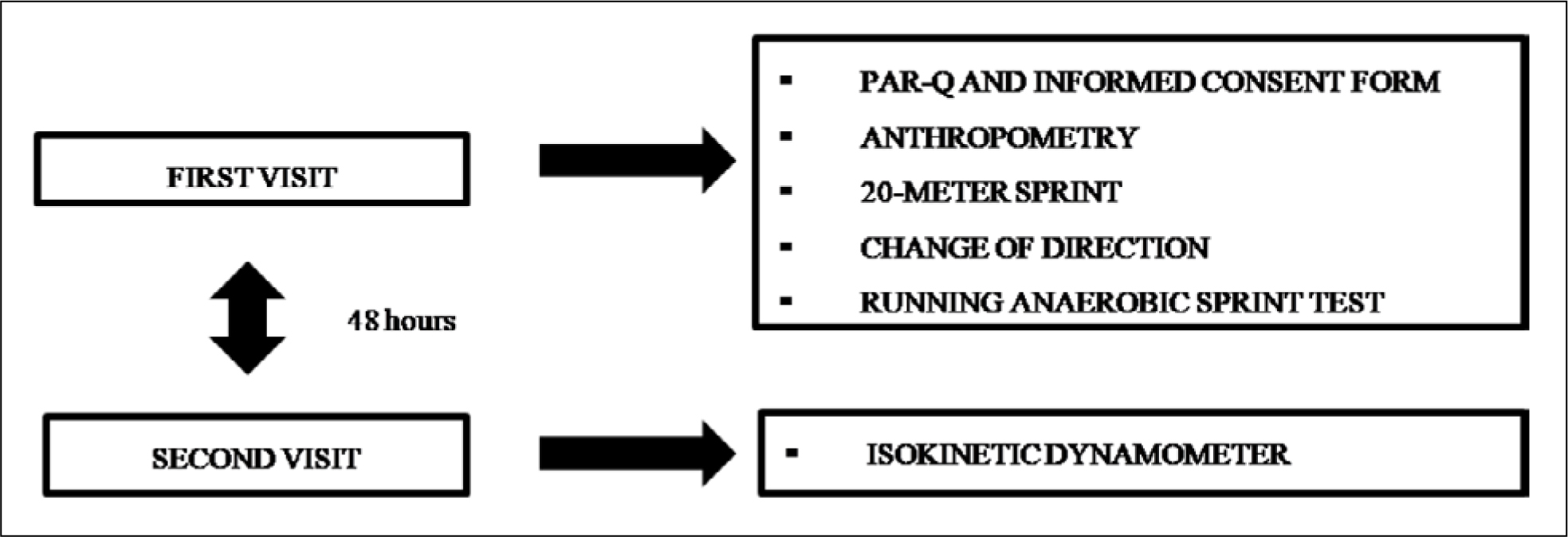 Two visits were carried out with an interval of 48 hours between them. On the first visit, procedures were performed in this order: 1) completing the informed consent form and the PAR-Q; 2) anthropometric measurements; 3) 20-meter sprint test; 4) COD test; 5) RAST. On the second visit, tests were performed on the isokinetic dynamometer (see Figure 1). Furthermore, it is important to emphasise that some environmental variables, such as temperature and relative humidity, were not controlled.