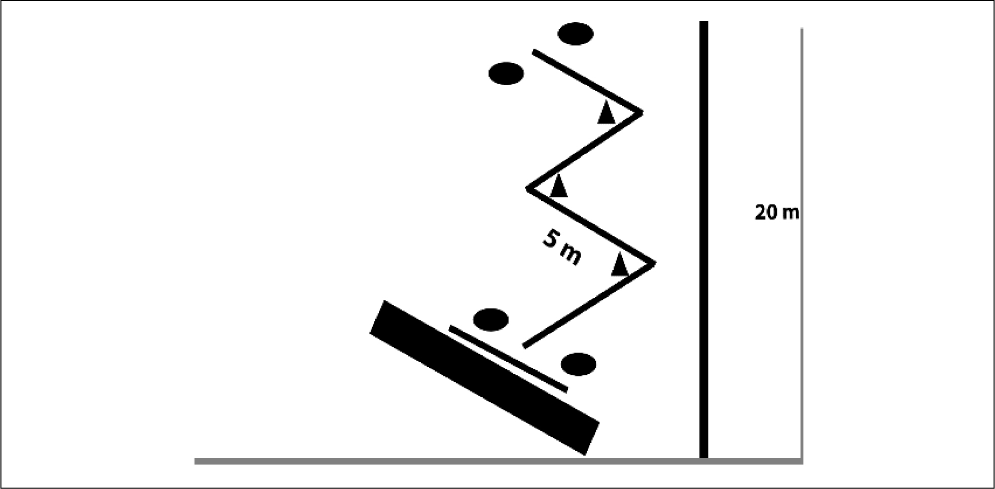 Two pairs of photocells (CEFISE®, Nova Odessa, São Paulo, Brazil) were positioned at 0 and 20 meters for the change of direction test, which was characterised by four segments of five meters (total linear distance of 20 meters), marked with cones (50 centimetres in height) and defined by 100° angles (see Figure 2). The test was performed on an indoor running track so that all subjects accelerated and decelerated as quickly as possible around each cone. Initially, two submaximal trials were performed as a warm-up, with no interval between them. Subsequently, after a five-minute rest interval, two maximal attempts were performed with a five-minute rest interval between them. In addition, all subjects were instructed to complete the test as quickly as possible and not to decelerate before crossing the second pair of photocells. The test was started at 0.3 meters behind the starting line, and only the best time was used in the data analysis (Loturco et al., 2019).