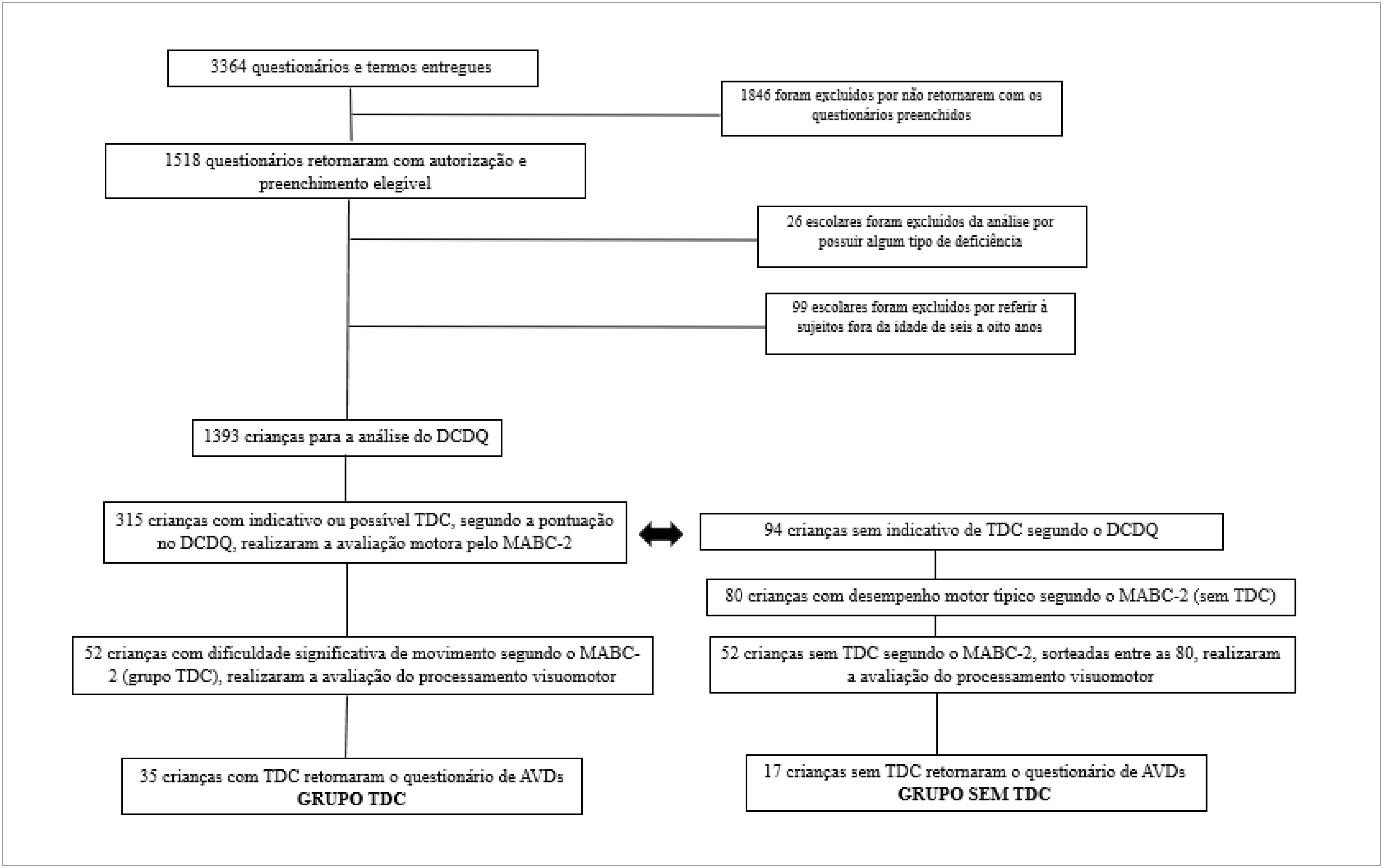 Foram eleitas 94 crianças com o resultado do DCDQ-BR que indicasse desempenho motor típico e com características comuns às 52 crianças com TDC (idade, sexo e escola). Os 94 indivíduos realizaram o MABC-2, levando a identificação de 80 crianças com resultado do teste acima do 16º percentil, indicando desempenho motor típico. Para se chegar a uma amostra pareada ao grupo com TDC, foram sorteadas 52 crianças para realizar a avaliação do processamento visuomotor, essas crianças contemplaram o grupo "sem TDC". A Figura 1 traz o fluxograma das etapas de seleção da amostra de crianças com e sem TDC.