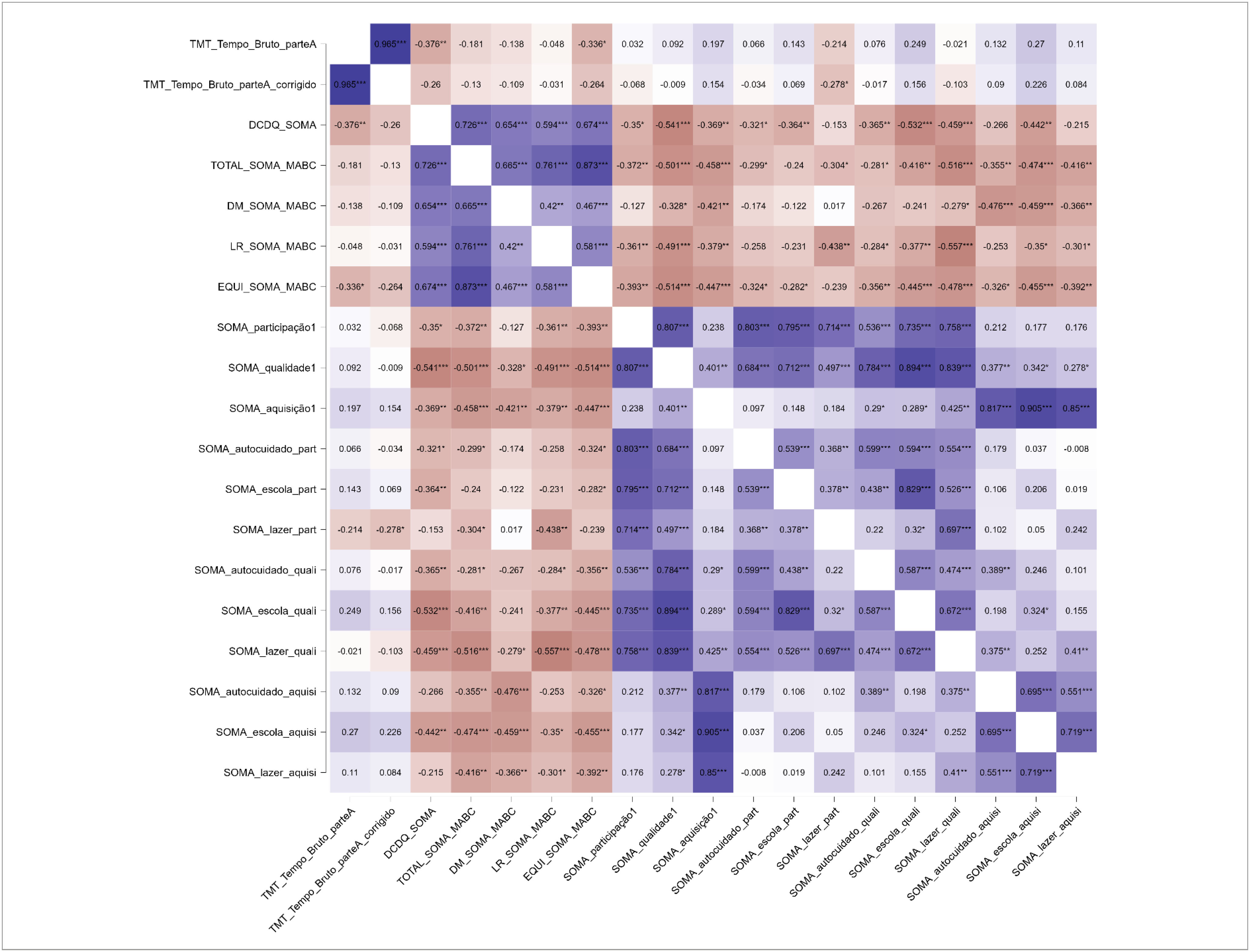 Figura 2 Heatmap das correlações entre o tempo de Processamento Visuomotor e os instrumentos DCDQ-Q, MABC-2 e DCDDaily-Q, para a amostra geral.