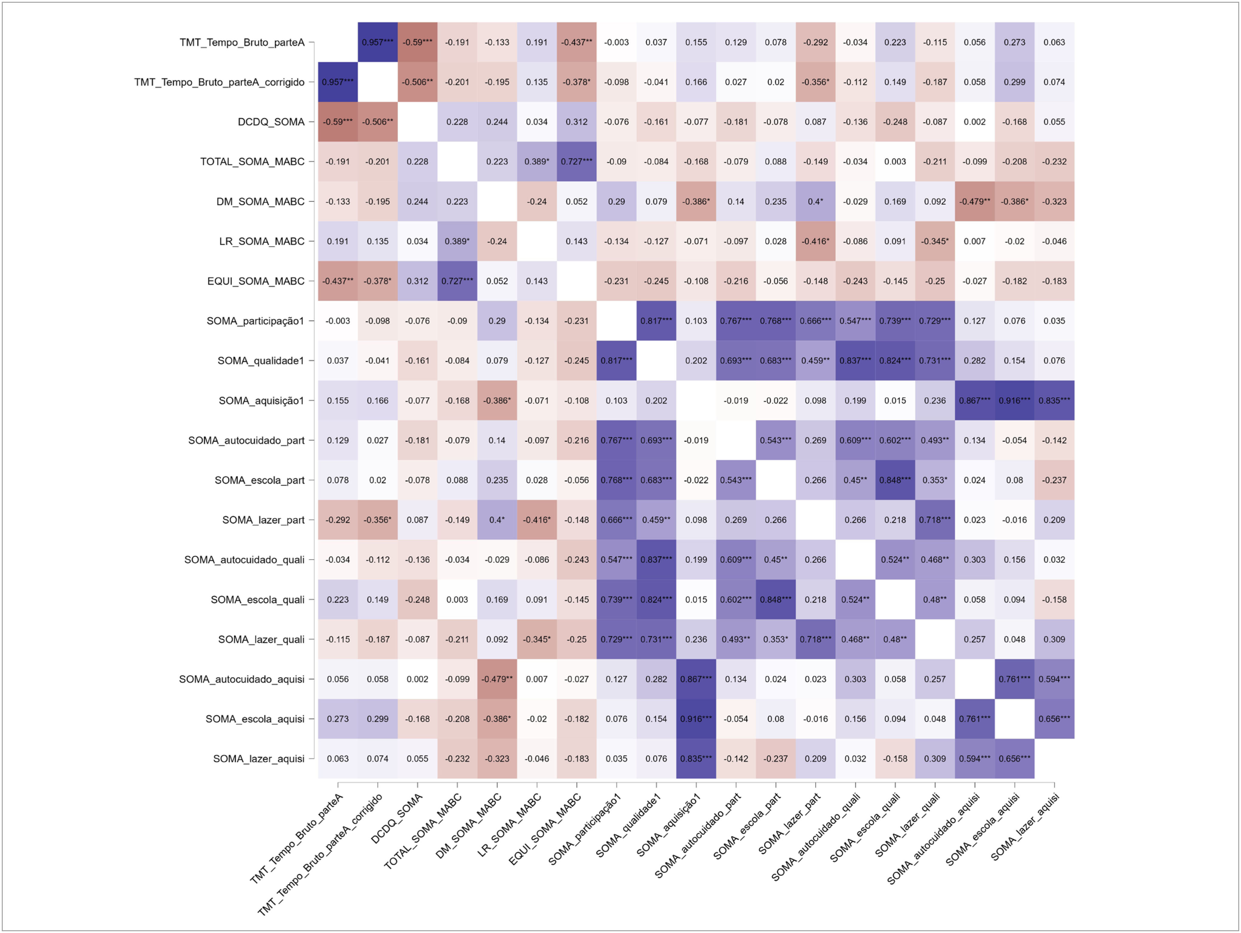 Figura 3 Heatmap das correlações entre o tempo de Processamento Visuomotor e os instrumentos DCDQ-Q, MABC-2 e DCDDaily-Q, para o grupo TDC.