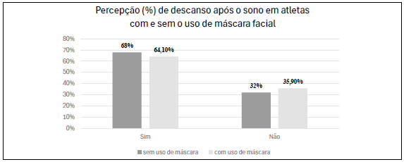 Em relação à qualidade do descanso (Figura 2) os resultados indicaram que 68% dos atletas que treinaram sem máscara relataram sentir-se totalmente recuperados após o sono, enquanto 32% não alcançaram essa sensação de descanso pleno. Entre os atletas que utilizaram máscara facial, esses percentuais foram de 64,1 e 35,9%, respectivamente. Embora a diferença entre os grupos possa parecer modesta à primeira vista, a variação de quase quatro pontos percentuais representa uma alteração consistente na recuperação percebida, que pode adquirir relevância ao longo de ciclos de treinamento mais prolongados, especialmente em modalidades de alta demanda como o judô.