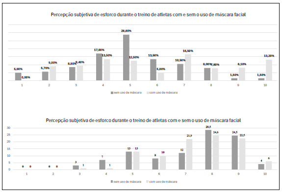 No que se refere à percepção da intensidade do treino, 90% dos atletas (n = 14) concordaram com a carga proposta na condição sem máscara, sem registros de discordância. Na condição com máscara, entretanto, a concordância caiu para 31% (n = 5), e a discordância foi reportada por 59,5% (n = 9). Esses dados indicam que o uso da máscara pode ter influenciado a percepção de esforço de forma significativa, levando parte dos atletas a interpretar o mesmo protocolo de treino como mais intenso.
