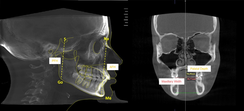 Orthodontic tracing was performed in the mid-sagittal plane slice using the same software. Cephalometric tracing assessed the following variables: anterior facial height (Na-Me), posterior facial height (S-Go), maxillary width, and palatal depth (Figure 1).