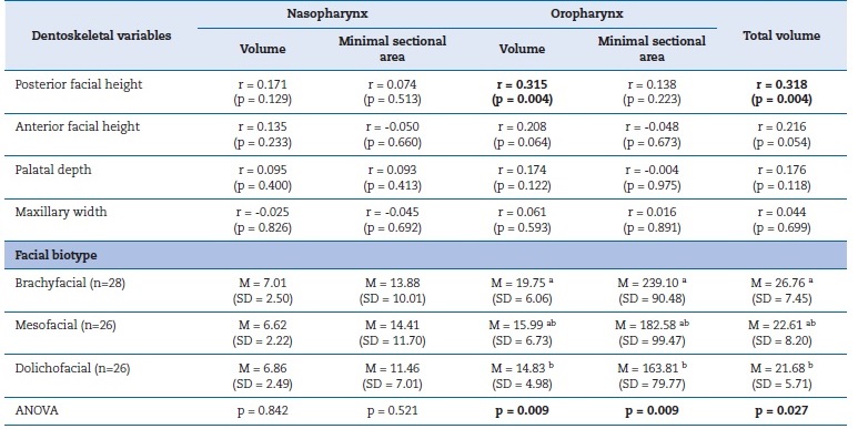 The Pearson correlation coefficient was used to determine the correlation between dentoskeletal variables and upper airway volume. A 5% significance level was set for the statistical tests’ results; i.e., differences and correlations were considered statistically significant when the significance value was lower than 0.50 (α=0.05).