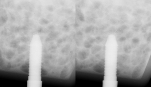 Figure 2 Stereoradiography (crossed-eye) pair at a 6° stereopsis angle (readers can look at the image by crossing the eyesight until three images are visible, then concentrate on the middle one, which will be in 3d). the lower part of the bone block is in front of the implant, superimposing the threads, conveying the illusion that there are no threads exposed, while in reality, there are between 6 (right side) and 10 (left side) exposed threads.
