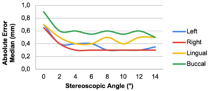 The implant’s neck-to-bone distance measured by each participant based on threads was converted to millimeters and compared to the actual distance to obtain the relative and absolute errors. The measurements were analyzed independently for each implant side and together for the overall perception of peri-implant bone height. Figure 4 shows the median absolute error, which is smaller for all stereoscopic angles when compared to 2D.