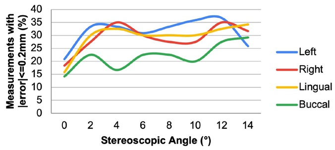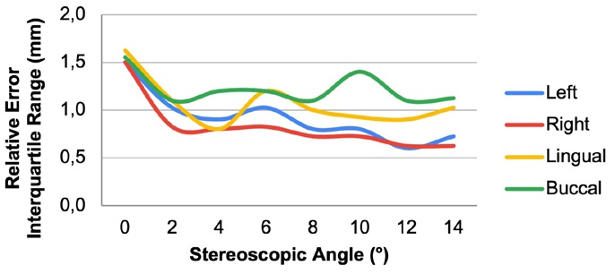 Concerning the ideal 3D angulation or stereo base, there seems to be no substantial improvement in accuracy nor dispersion reduction with angles greater than 4°. Furthermore, angles greater than 6° lead to an expected increased visual fatigue,19 as reported by the observers. Thus, a stereopsis angle between 4° and 6° would be the most effective method to reduce the measurement error without sacrificing viewing comfort.