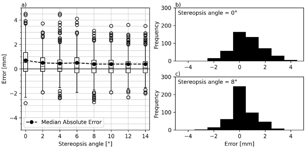 The bootstrap statistical test16 was used to infer the median absolute error for stereopsis angles 0° and 8°. For 0°, the median absolute error was between 0.6 and 0.8 mm (95% confidence interval). For 8°, the median absolute error was between 0.3 and 0.5 mm (95% confidence interval). The 8° stereopsis angle led to a better accuracy with a p-value smaller than 0.001 for the null hypothesis, which stated that there is no difference in median absolute errors between the two stereopsis angles.