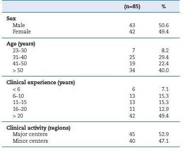 Within the framework of this sociodemographic characterization study, comprehensive data acquisition encompassed variables such as sex, age (23-30; 31-40; 41-50; >50 years), clinical experience (<6; 6-10; 11-15; 16-20; >20 years), and the geographical region of clinical activity. To facilitate nuanced analysis, the different districts and the two autonomous regions were categorized into two distinct groups: major centers (Porto and Lisbon) and minor centers (the other 12 districts and autonomous regions).