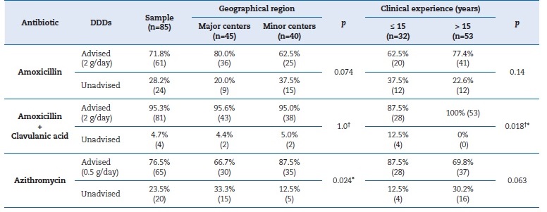 Azithromycin was administered according to the recommended DDDs by 76.5% of the respondents, IC0.95 [66.7%- 84.5%], and the observed difference was statistically significant (binomial test=0.5; p<0.001). Among professionals working in the major centers, 66.7% conventionally prescribed this antibiotic, while 87.5% of the remaining professionals did so, with statistically significant differences (χ2 = 5.108; df=1; p=0.024) (Table 3). Appropriate azithromycin DDDs were prescribed by 87.5% of professionals with less clinical experience, compared to the overall appropriate prescriptions among more experienced professionals, not attaining statistically significant differences (χ2 = 3.470; df=1; p=0.063) (Table 3).