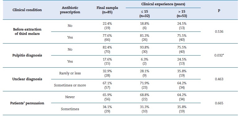 When confronted with specific clinical conditions, such as before third-molar extraction, 81.3% of respondents with less clinical experience admitted to prescribing antibiotics, compared to 75.5% of the other professionals, although the difference found was not statistically significant (χ2 = 0.384; df=1; p=0.536) (Table 4). When faced with a diagnosis of pulpitis, 24.5% of respondents with more clinical experience admitted to prescribing antibiotics, compared to 6.3% in the group of less experienced professionals, achieving statistical significance (χ2 = 4.587; df=1; p=0.032) (Table 4).