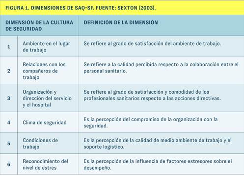 Para la medición cuantitativa de la cultura de seguridad, se utilizó el cuestionario Safety Attitudes Questionnaire (SAQ) creado por Sexton et al. (2003) con financiación de la Robert Wood Johnson Foundation en colaboración con de Agency for Healthcare Research and Quality (AHRQ). Los ítems del SAQ se desarrollaron en grupos focales y reuniones con profesionales sanitarios, revisiones bibliográficas y mesas redondas, que generaron un conjunto de más de 100 ítems que cubren cuatro áreas: clima de seguridad, trabajo en equipo, detección del estrés y clima organizativo. Para este estudio se utilizó una versión abreviada denominada SAQ-SF con 6 dimensiones sobre actitudes que contiene 40 ítems (cf. Figura 1).