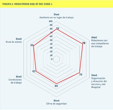 En el caso 1, el ambiente de trabajo y las relaciones con los compañeros fueron identificados como fortalezas, indicando un alto nivel de identificación de los empleados con el hospital y una cooperación positiva entre colegas. Sin embargo, se observaron puntos débiles en las áreas del clima de seguridad y las condiciones de trabajo, con preocupación por los niveles de estrés que afectaban negativamente al rendimiento. Estos resultados sugieren la necesidad de intervenciones para mejorar las prácticas de seguridad, abordar los problemas relacionados con el estrés y mejorar la cultura general de seguridad del hospital.