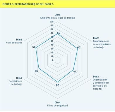 Comparando los diagramas de ambos casos (cf. Figura 4), se observa una notable diferencia en las puntuaciones, ya que los resultados del caso 2 son inferiores a los del caso 1. Sin embargo, la tendencia es la misma en ambos casos. El entorno laboral y las relaciones con los compañeros de trabajo aparecen como los aspectos más fuertes, mientras que la dirección de la organización, el clima de seguridad y las condiciones de trabajo siguen siendo las dimensiones más débiles en ambos casos.