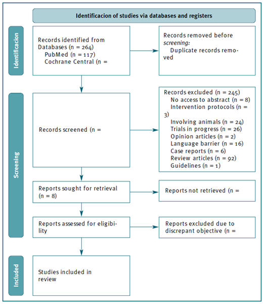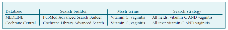 The authors conducted a systematic review by searching for indexed scientific publications in PubMed and Cochrane Central Library databases. The aforementioned research was conducted on October 30, 2023, and the related Medical Subject Headings (MeSH) terms used were “vitamin C” and “vaginitis”. No temporal filter was applied. Table I outlines the research process on the databases.