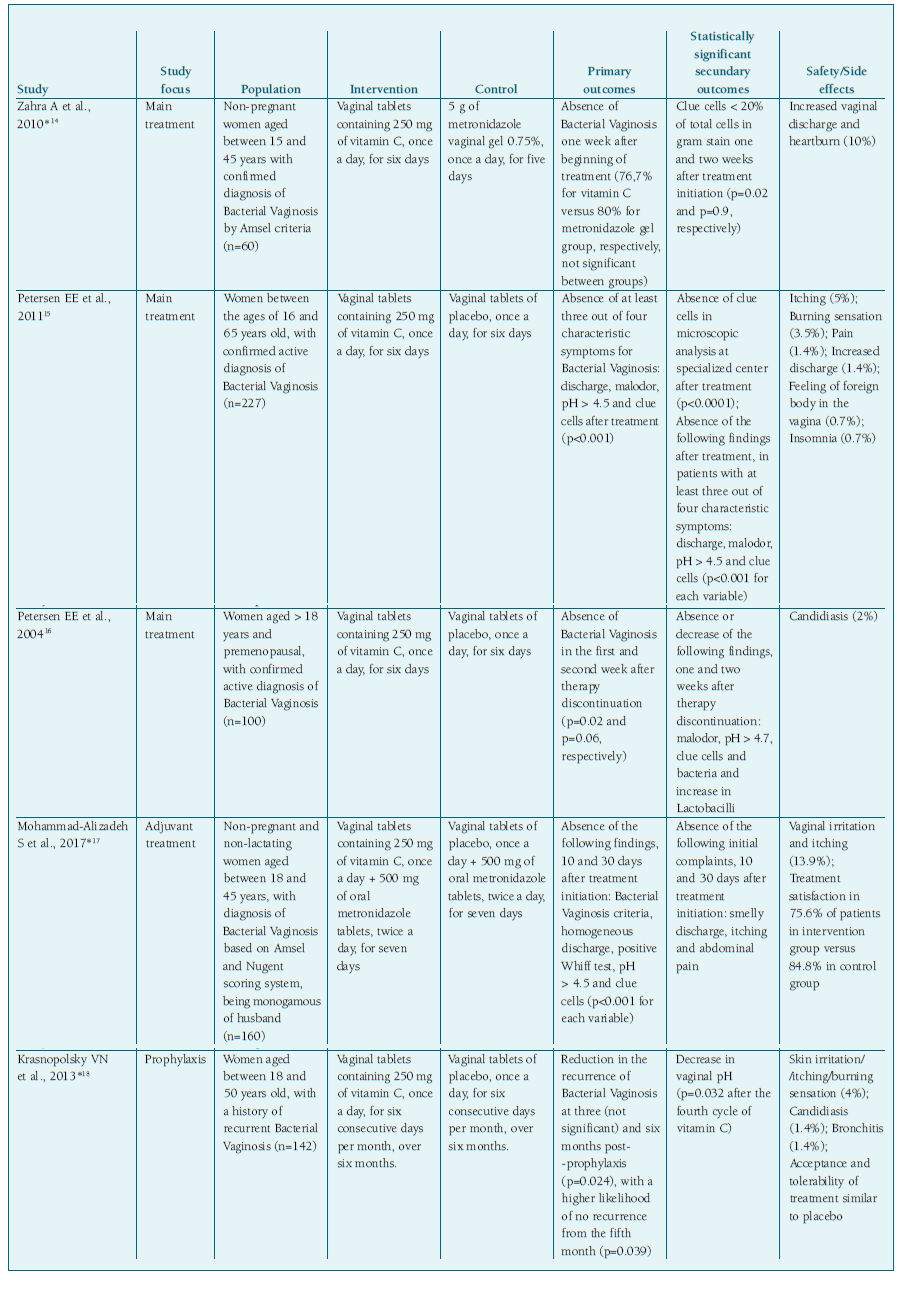 In the only study comparing vitamin C to placebo as adjunct to antibiotic therapy, significantly better results were observed for vitamin C group regarding the absence of BV and improvement in the parameters of Amsel and Nugent criteria. There was also an improvement in initial complaints reported by patients, such as itching and abdominal pain, one month after the start of treatment17.