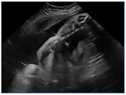 However, 12 hours after shunt placement, ultrasound showed a large right pleural effusion - Figure 4 (larger than before shunt placement - Figure 5). The ultrasound image suggested migration of the catheter into the thoracic cavity with atelectasis and reappearence of pleural effusion (Figure 6).