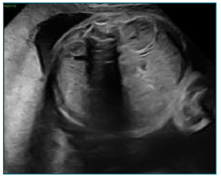 At 32 weeks (Figure 1), the fetus was found to have imaging findings consistent with fetal hydrops (bilateral pleural effusion and ascites), showing a sudden deterioration compared to the ultrasound performed at 28 weeks. Flowmetry was normal, but considering the worsening, a multidisciplinary meeting opted for hospitalization with induction of lung maturation and placement of pleuro-amniotic shunt.