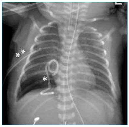 There was worsening of respiratory difficulty under non-invasive ventilation in the first hours of life, and a chest X-ray (Figure 7) revealed a large right pleural effusion. In this context, invasive ventilation and thoracentesis (pleural fluid with characteristics of chylothorax, negative bacteriological examination) were performed, followed by placement of a chest tube. Approximately 40 mL/day was drained with progressive reduction. Accidental removal of the chest tube occurred on day 4, with radiological surveillance showing complete resolution of the effusion by day 13. Room air was achieved by day 5 of life. The newborn was discharged from the hospital at 38 days of life, exclusively breastfed, with no recurrence of pleural effusion. Reevaluation at 2 months in clinic (corrected age of 2 weeks) showed good growth and psychomotor development. Currently, the newborn only requires follow-up in neonatology and pediatric surgery with indication for surgical removal of the Intrapleural shunt at 6 months.