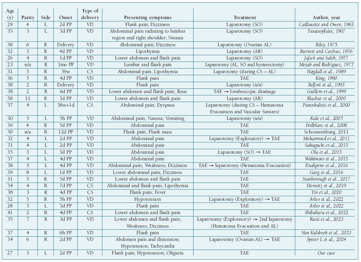 A literature review of pregnancy-related OAA rupture cases, summarized in Table I, shows a median patient’s age of 35 years (±4.4 years), with most being multiparous. Eighty-seven percent of cases occurred postpartum, with a mean onset of symptoms on the 4th day. Only 3 postpartum cases followed cesarean sections, and 61% of OAA ruptures were right-sided. This higher frequency of right OAA may be due to anatomical variations during pregnancy, as the uterus tends to deviate to this side5.