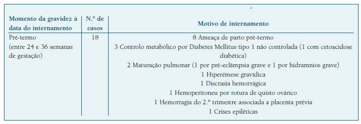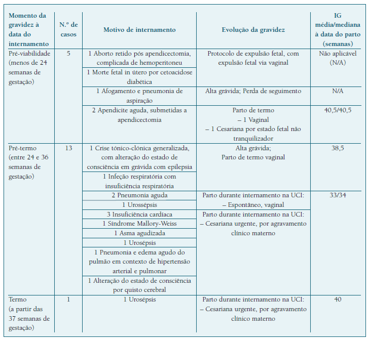Quando o internamento na UCI ocorreu durante a gravidez, os motivos foram de causa não obstétrica, verificando-se, por vezes, mais do que um diagnóstico em simultâneo. Registaram-se: cinco casos de pré-viabilidade; treze pré-termo; um de termo. Descrição dos casos no Quadro III.