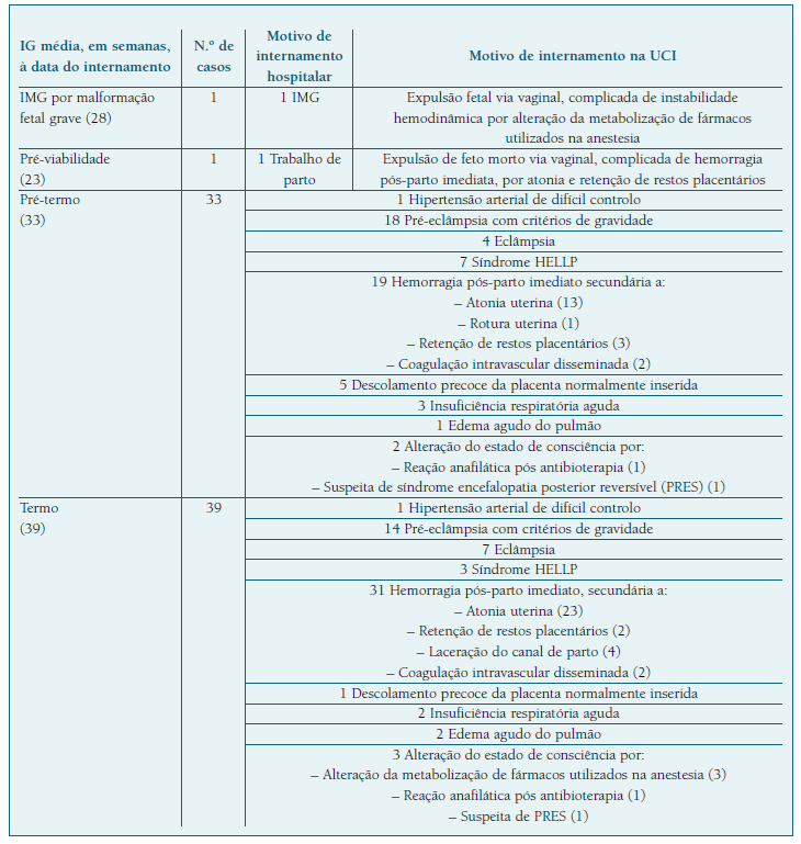 No grupo em que a complicação, que motivou internamento na UCI, decorreu no período peri-parto, o motivo de internamento hospitalar foi de causa obstétrica, existindo casos com mais de um diagnóstico: pré--eclâmpsia (N=15), início de trabalho de parto (N=14), indução de trabalho de parto (N=12), hemorragia vaginal (N=8), rutura prematura de membranas (N=7), eclâmpsia (N=6), hipertensão gestacional não controlada (N=3), Síndrome HEELP (N=3), descolamento prematuro da placenta normalmente inserida (N=3), cesariana eletiva (N=2) e interrupção médico-legal da gravidez (IMG) (N=1). Os motivos de internamento na UCI incluíram agravamento de condições prévias ao trabalho de parto e/ou complicações decorrentes do parto, até duas horas pós-parto, verificando-se em mais do que um caso, mais de um motivo. Verificou-se um caso de IMG, um de pré-viabilidade, 33 pré-termo e 39 de termo. Descrição dos casos no Quadro V.
