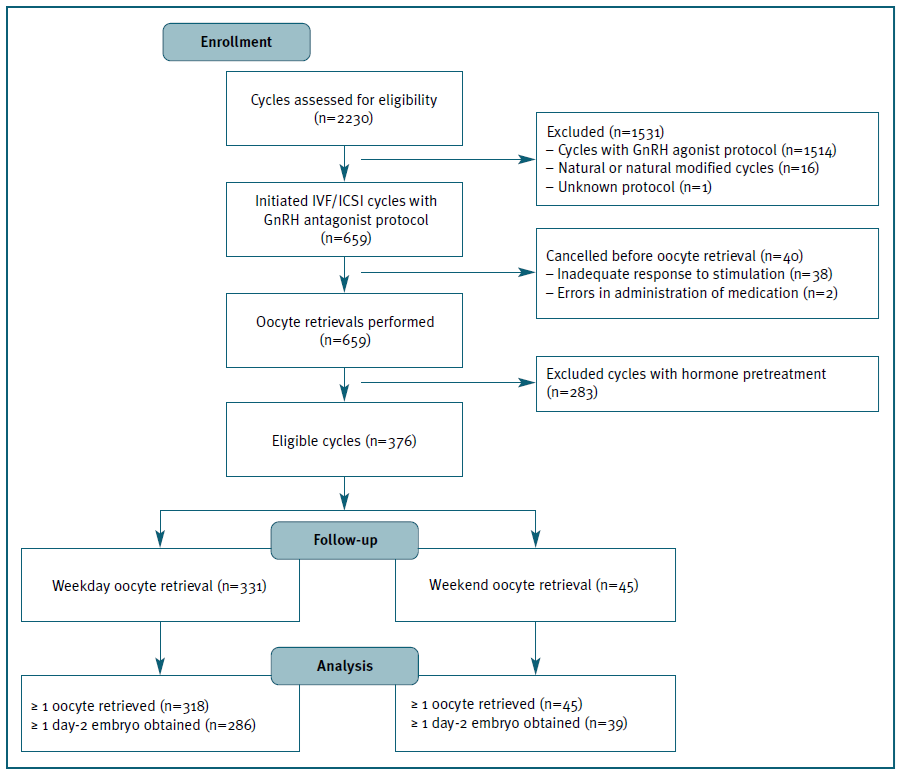 Therefore, the aim of this study was to determine the best weekday to start gonadotrophin ovarian stimulation to reduce the frequency of weekend oocyte retrievals in IVF/ICSI cycles using GnRH antagonist protocol when a fresh embryo transfer is anticipated, as well as to evaluate the impact of the day of oocyte retrieval in laboratory outcomes.