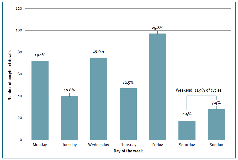 Figure 2 Frequency distribution of oocyte retrieval by day of the week. Y axis represents the absolute number of oocyte retrievals. X axis represents each day of the week. Relative percentages of the overall total number of oocyte retrievals are represented on the top of each column.
