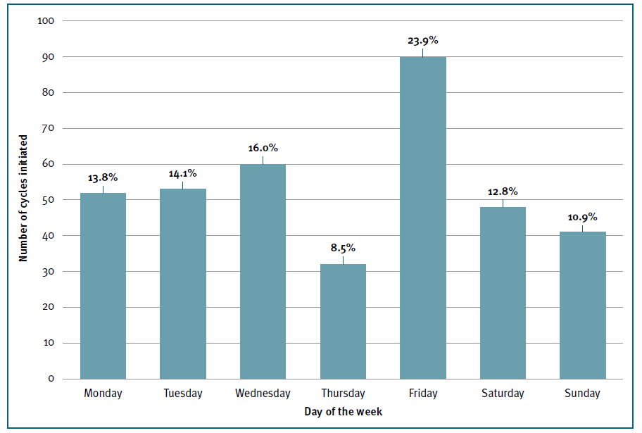 Figure 3 Frequency distribution of the starting day of gonadotrophin stimulation by day of the week. Y axis represents the absolute number of IVF/ICSI cycles in which gonadotrophin stimulation was initiated. X axis represents each day of the week. Relative percentages of the overall total number of cycles are represented on the top of each column.