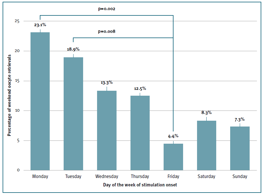 Figure 4 Frequency distribution and probability of weekend oocyte retrieval by day of the week of gonadotrophin stimulation onset. Y axis represents the percentage of weekend oocyte retrievals. X axis represents the day of the week in which gonadotrophin stimulation was initiated. Compared groups and p values are shown on the top of the columns.