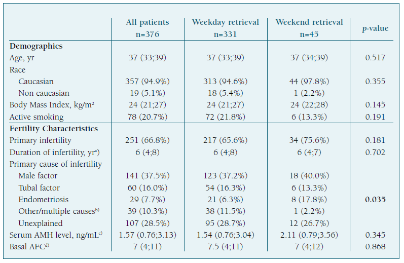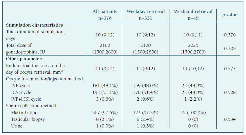 Treatment outcomes are presented in Table III and were analyzed separately according to the day of oocyte retrieval (weekday vs. weekend). Of the 376 ovarian retrievals studied, a median of 6 oocytes (IQR 3;10) were collected per procedure, with an overall fertilization rate of 70.9%.