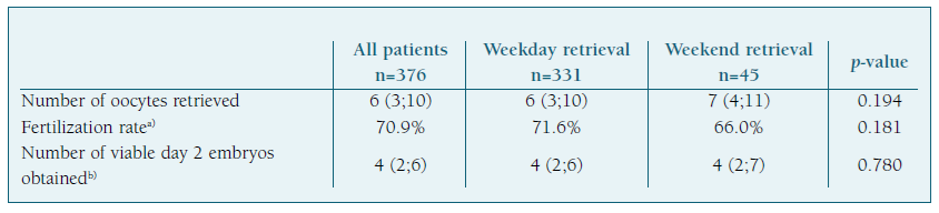 The number of oocytes retrieved (p=0.194), fertilization rate (p=0.181) and the number of viable day 2 embryos obtained (p=0.780) were not influenced by the day in which oocyte retrieval was performed. Although the fertilization rate (66% vs. 71.6%) was lower in the weekend group, the difference was not statistically significant (p>0.05).