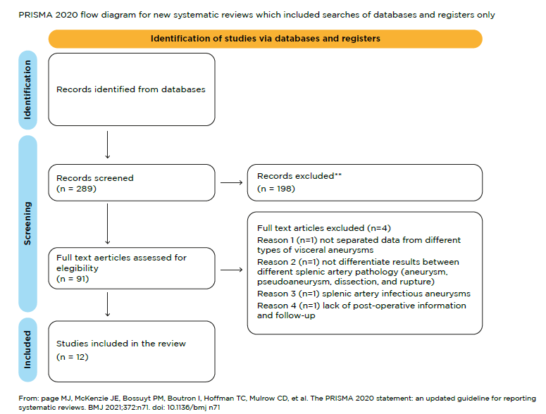A systematic review was performed according to the PRISMA statement.14 A literature search was performed in the Medline database in the last five years, from January 2019 to January 2024, using the following “keywords” (visceral OR splanchnic OR splenic) AND (aneurysm).