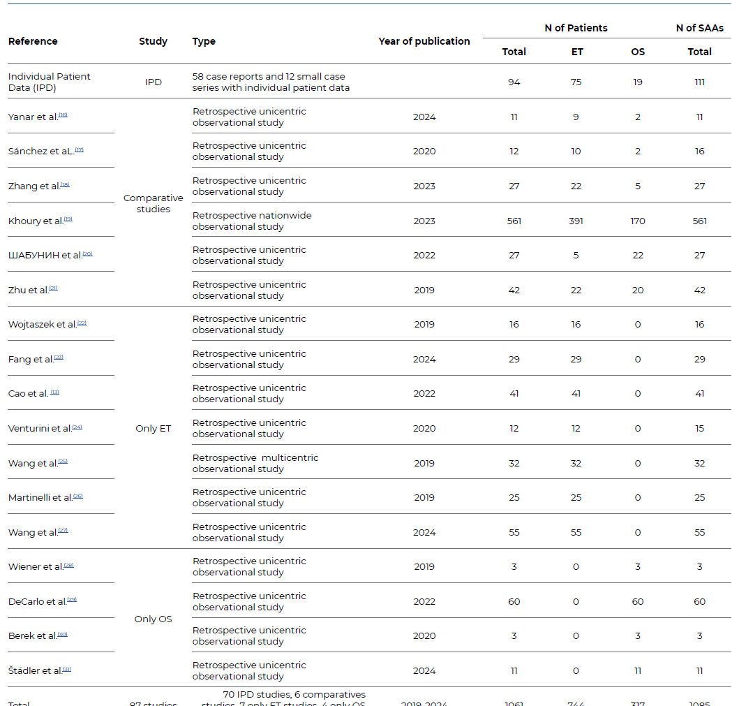 Most studies (58) were case reports or small case series with individual patient data (12), 14 were unicentric case series, one was multicentric and one was based on national data. Six were comparative studies; seven only included ET patients, and four only included OS patients, Table 1.