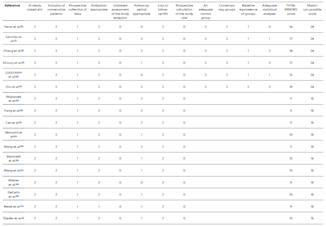 The methodology of the studies and risk of bias were systematically assessed by two independent reviewers (AC and MM) using the Methodological Index for Non-Randomized Studies (MINORS) score,15 with a maximum score of 16 for non-comparative and 24 for comparative studies. A score ≤8 was considered poor quality, 9-14 moderate quality, and 15-16 good quality for non-comparative studies. For comparative studies, the cut-off points were ≤14, 15-22, and 23-24.