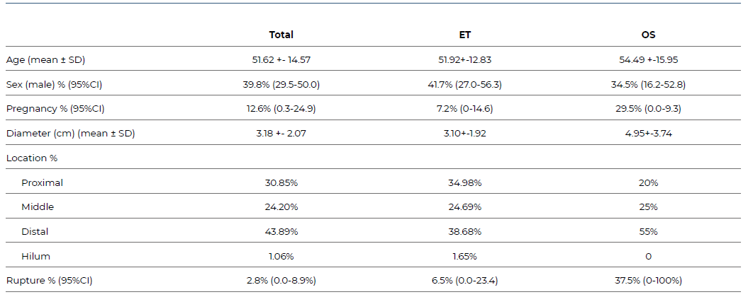 The mean age was 51.62 +- 14.57, with older patients in the OS group (54.49±15.95 vs 51.92±12.83) and 39.8% (29.5-50.0) were male (OS 34.5% [16.2-52.8] vs ET 41.7% [27.0-56.3]). A total of 12.6% (0.3-24.9) were detected during pregnancy, with a higher frequency of pregnancy also in the OS group (29.5% [0.0-9.3] vs 7.2% [0-14.6%]), Table 3.