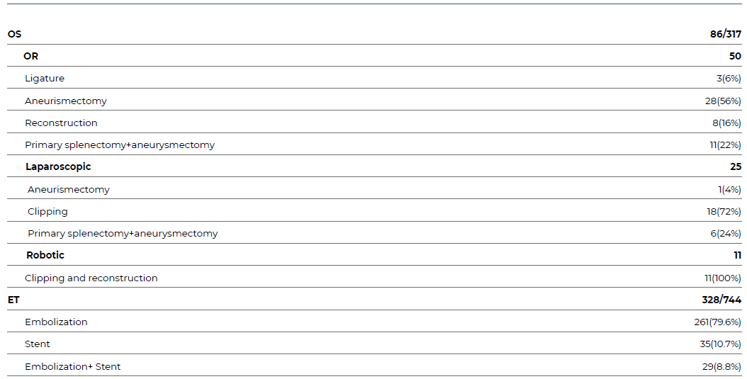 The most performed conventional open reconstruction procedure was aneurismectomy (28/60). Overall, three patients received OS with ligation; eight aneurismectomy and reconstruction (seven end-to-end anastomosis and one bypass), and 11 primary splenectomies were performed. Also, 6/25 (24%) were submitted to laparoscopic splenectomy and aneurysmectomy, 18 (72%) laparoscopic clipping, and one (4%) to laparoscopic resection. Only one study included robotic surgery, in which 11 (100%) patients were submitted to aneurysm clipping and reconstruction, Table 4.