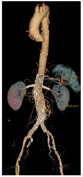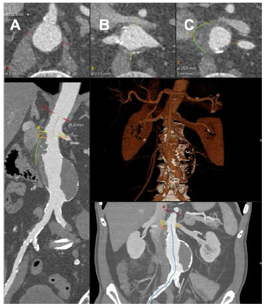 Following a thorough preoperative clinical and radiological assessment, an endovascular aortic repair (EVAR) was considered the most suitable treatment for this patient.
