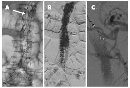 Although not seen, the superior mesenteric artery is patent. The arrow on panel A indicates the ‘S’ shape radiopaque marker implanted on the anterior aspect of the graft for position reference. Panel C shows the completion angiography after the balloon-expandable stent graft deployed via the upper-arm approach in the superior mesenteric artery.
