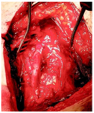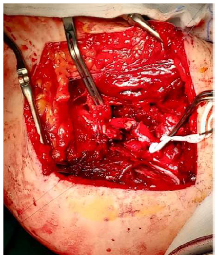 Considering the emergency, the patient was immediately transferred to the operating room. Surgical exposure revealed an approximately 20-cm-wide total resection of muscle and subcutaneous tissue in the thigh area. The SFA was severed (Figure 1) and presented severe atheroma with multiple and irregular calcifications. Additionally, the SFV’s anterior wall was disrupted and associated with local thrombosis. The injured SFA segment (4-5 cm) was resected, the third proximal segment of the right great saphenous vein (GSV) was isolated and prepared, and a GSV to SFA interposition bypass was performed (Figure 2). The SFV was ligated.