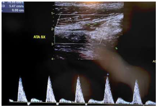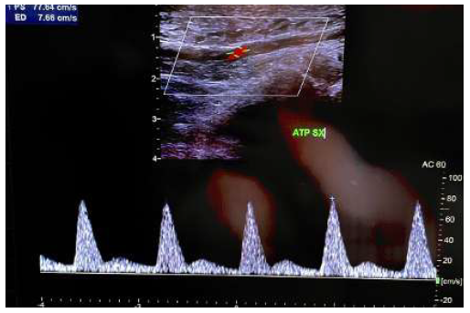 During the intervention, the patient experienced three cardiac arrests, and 15 bags of red blood cells were transfused. Immediately after the operation, the foot was warm, assuming normal colouration and pulsation at the ankle was detected. The presence of compartment syndrome was excluded. A duplex ultrasound performed shortly after the procedure showed direct blood flow to the tibial arteries, Figures 3 and 4.