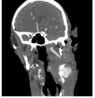 Figure 1 Computed tomography angiography at admission showing a carotid rupture within a calcified atherosclerotic plaque and hematoma compressing the cervical structures (coronal view)