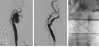 extravasating contrast from the ruptured site at the origin of the internal carotid artery; B) completion angiogram after exclusion with a self-expandable stentgraft; C) 7x50 mm Viabahn® deployed from the origin of the internal carotid artery.