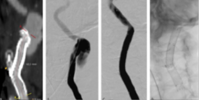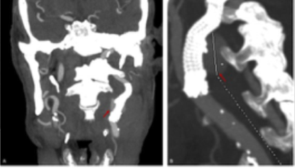 Control CTA at 24 hours revealed a "type 1 endoleak" with contrast leak filling from the proximal landing zone, Figure 3. A second procedure was performed through a transfemoral approach. An 8Fr 70cm sheath was placed at the origin of the CCA through a right percutaneous femoral access. The external carotid artery ostium was occluded with an 8mm vascular plug (Amplatzer™ Vascular Plug 4, 8x13.5), followed by stentgraft extension to the common carotid artery with an 8x50 Viabahn®, Figure 4.