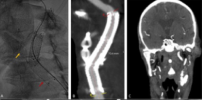 Figure 4 Post-operative imaging after external carotid artery (ECA) occlusion with a plug with an 8mm vascular plug stentgraft extension to the common carotid artery. A) Intraoperative image showing Amplatzer™ Vascular Plug 4, 8x13.5 (yellow arrow) and 8x50 Viabahn® (red arrow); B) computed tomography angiography at 24h showing ECA occlusion and patent stents with resolution of the leak; C) computed tomography angiography at one month significant reduction of the cervical hematoma (coronal view).