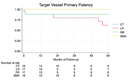 Figure 1 Kaplan-Meier analysis of target vessel patency of patients with type IV thoracoabdominal aneurysm treated with elective open surgery, included in the study. CT - celiac trunk; LR - left renal artery; RR - right renal artery, SMA - superior mesenteric artery.
