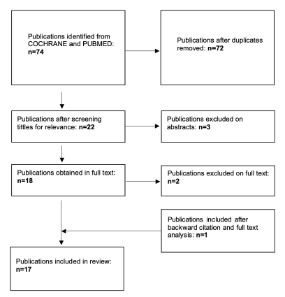 The initial search yielded 74 studies, Figure 1. After removing duplicates and the screening process based on title and abstract, 22 studies were thoroughly examined in full text. One additional study was included by backward citation. After full text analysis, 17 studies fulfilled all the inclusion criteria, encompassing a total of 1123 patients. Subsequent steps involved data extraction and assessment of study quality. Common reasons for exclusion included inadequate sample sizes or unclear reporting of outcomes related to the Superior Vena Cava (SVC), abstract or full text not available, SVCS caused by a benign cause, and the evaluation of outcomes regarding the implantation of stent and other endovascular devices at the same time.