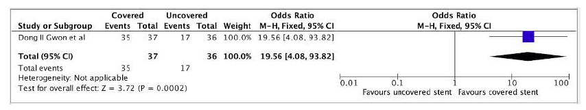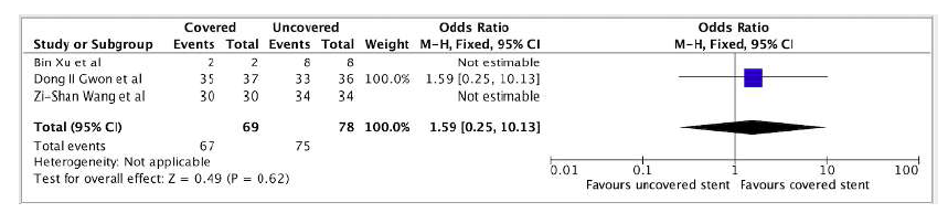 Across all comparative studies,17,21,23 the technical success rate for both covered and uncovered stents was 100%, and accordingly, the comparative Odds Ratio (OR) could not be calculated. The pooled data for covered stents shows a technical success rate 100% (CI not estimable [NE]). The pooled data for uncovered stents was 97.9% (95% CI 96.5-99.3).