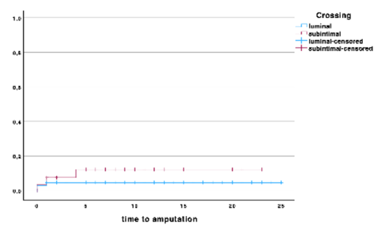 Figure 2 Kaplan-meier curve for time to amputation, comparing patients with subintimal or intraluminal lesion crossing